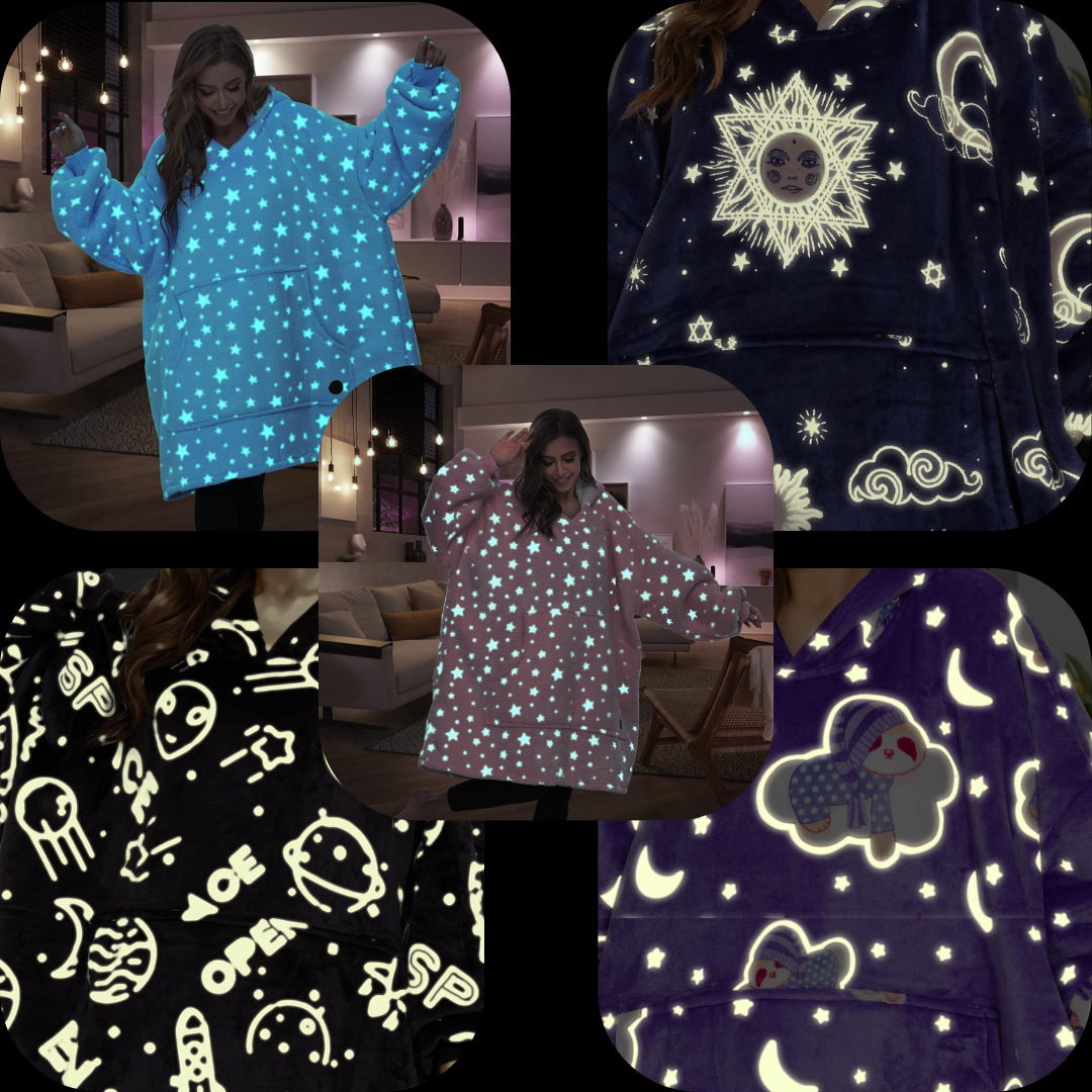 With playful glow-in-the-dark patterns, our blanket hoodies make bedtime, movie nights, and sleepovers extra fun. Kids love it. Adults love it even more.